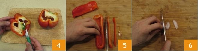 Pasa al pimiento: quita el pedúnculo, ábrelo por la mitad y retira el corazón 4 y las semillas; luego córtalo en tiras, después en tiras 5 y finalmente en dados del mismo tamaño. Limpia y corta finamente también el chalote 6; reserva las verduras por un momento.