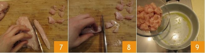 Pasa al pollo: corta la pechuga en tiras 7 y luego en dados de aproximadamente 2 cm de grosor 8; calienta una sartén con un poco de aceite de oliva y luego añade el pollo 9;