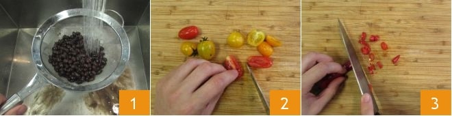 Para preparar el desayuno mexicano, empieza escurriendo los frijoles negros y enjuagándolos, después resérvalos 1. Ocúpate de los tomates: lávalos y córtalos por la mitad 2, luego pica el chile quitándole el tallo y las semillas internas 3.