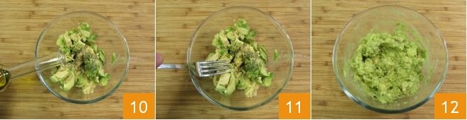 y aceite 10, luego aplástalo todo con un tenedor 11 para obtener un puré grueso que reservarás 12.