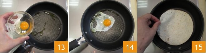 Finalmente, prepara los huevos fritos sumergiéndolos en una sartén con un poco de aceite caliente 13. Cuando la clara esté cuajada y la yema aún líquida, coloca los huevos en un plato 14. En la misma sartén calienta brevemente las tortillas de una en una 15,