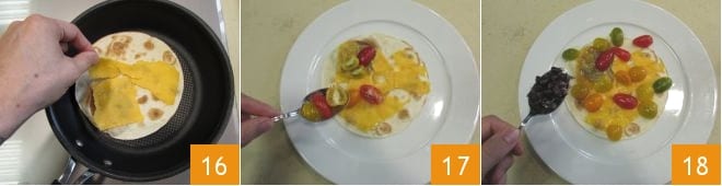 luego voltéalas y en la parte caliente coloca el cheddar desmenuzado a mano para que se derrita completamente 16. Transfiere la tortilla a un plato y monta el resto de los ingredientes: distribuye una cucharada de tomates 17, luego los frijoles negros 18,