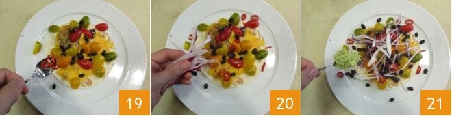 el chile 19, el cebollino escurrido 20 y decora con unas cucharadas de guacamole 21.