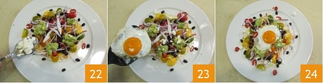 Termina con un poco de feta desmenuzada 22 y coloca el huevo frito en el centro 23. Ajusta de sal y pimienta y ¡aquí tienes listo tu desayuno mexicano 24!