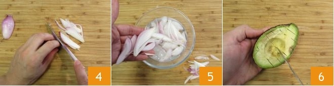 Pela el cebollino rojo y córtalo en rodajas gruesas 4, luego sumérgelo en agua con hielo: de esta manera permanecerá crujiente y perderá parte del olor 5. Finalmente, prepara el guacamole: después de cortar por la mitad el aguacate, quítale la semilla central, luego haz cortes verticales y horizontales. Mantén la fruta en la mano y ten cuidado de no perforar la piel, lo que evitará que te lastimes con la hoja 6.