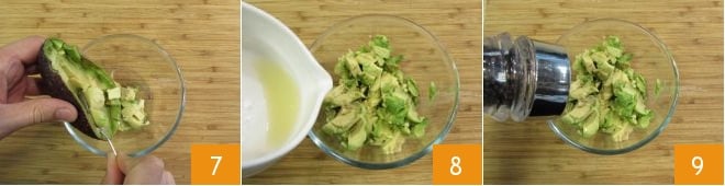Saca los cubos con una cuchara y colócalos en un bol 7, ralla la cáscara del limón y agrégala al aguacate, luego exprime su jugo y añádelo también 8. Condimenta con sal, pimienta 9