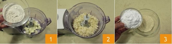 Para preparar los diamantes de cacao y almendras, empezad vertiendo la mantequilla fría en trozos y 230 g de harina tipo 00 en un procesador 1. Activad las cuchillas hasta obtener una mezcla arenosa 2 y reservadla en un bol grande. Tomad otro bol pequeño en el que mezclar el azúcar glas y la harina de almendras 3,