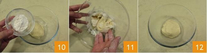 En el otro añadid los 20 g de harina 00 restantes 10 y amasad la masa ayudándoos con las manos 11 hasta obtener una masa lisa y homogénea 12.