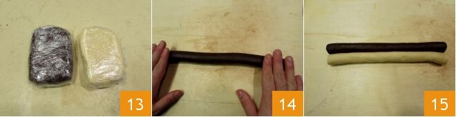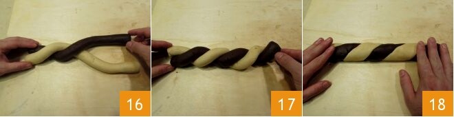 Tomad ahora un cilindro de cacao y uno de solo harina y colocadlos uno al lado del otro: entrelazadlos superponiendo un rollo sobre el otro 16 hasta llegar al final de los rollos 17: enrollad el rollo bicolor obtenido presionándolo y alargándolo ligeramente con la presión de las manos hasta obtener un nuevo rollo de aproximadamente 3 cm de diámetro 18. Repetid la operación con los otros dos rollos.