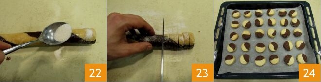 Espolvoread los rollos con la mezcla obtenida de azúcar y canela 22 y cortad los cilindros en discos de 7 mm de grosor 23 que colocaréis en una bandeja forrada con papel de horno. Hornead en horno estático precalentado a 160°C durante 20 minutos (para estas galletas no recomendamos el uso del horno ventilado o, como alternativa, recomendamos probar la cocción de pocas piezas como primera horneada para verificar tiempos y temperatura para las siguientes). Una vez cocidos vuestros diamantes de cacao y almendras, sacadlos del horno 24, dejadlos templar y ¡disfrutad!