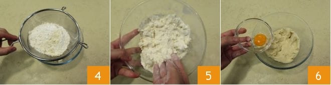 luego tamizadlos juntos en el bol donde habéis colocado la mezcla arenosa de mantequilla y harina 4, mezclando los ingredientes rápidamente con las manos 5. Luego añadid los huevos 6 y continuad amasando con las manos rápidamente, hasta obtener una mezcla homogénea y lisa.