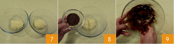 Dividid la masa obtenida en dos boles diferentes 7: en uno añadid el cacao 8 y comenzad a amasar con las manos 9 hasta obtener una masa homogénea.