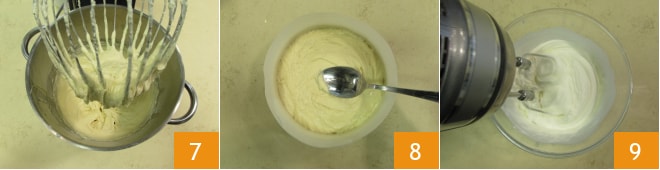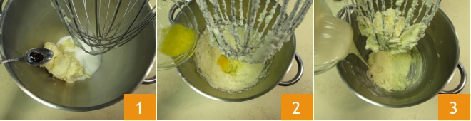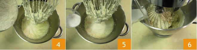 Trabajad la mezcla durante unos segundos con la varilla, luego añadid la harina 4 y la levadura 5. Trabajad de nuevo la mezcla con la varilla y verted la leche a hilo a temperatura ambiente 6.