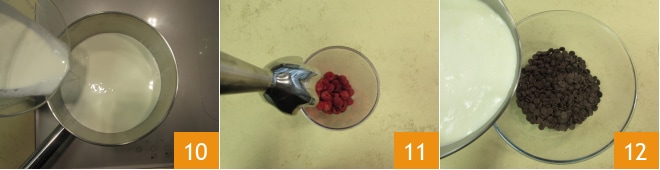 Verted la nata restante en un cazo 10 y llevad a ebullición. Verted las frambuesas en un recipiente alto y triturad con una batidora de mano 11 hasta obtener un puré. Trasladad el chocolate a un bol y en cuanto la nata empiece a hervir, verted la mitad sobre el chocolate 12.