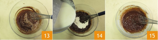 Mezclad con una varilla 13 y verted luego la nata caliente restante 14. Mezclad la mezcla hasta la completa disolución del chocolate 15.
