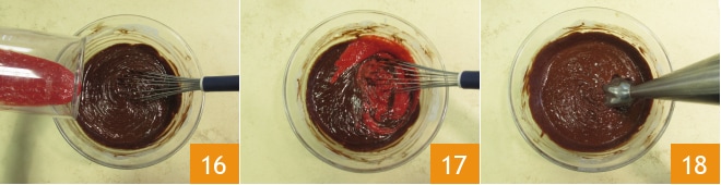 Verted el puré de frambuesas dentro de la ganache 16, mezclad bien con una varilla 17, luego triturad ligeramente con la batidora de mano sin incorporar aire 18.