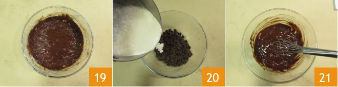 Cubrid con film y dejad enfriar a temperatura ambiente 19. Ahora ocupáos de la cobertura. Llevad la nata a ebullición en un cazo y vertedla sobre el chocolate, que habréis colocado en un bol 20. Mezclad bien la mezcla hasta la completa disolución del chocolate 21.