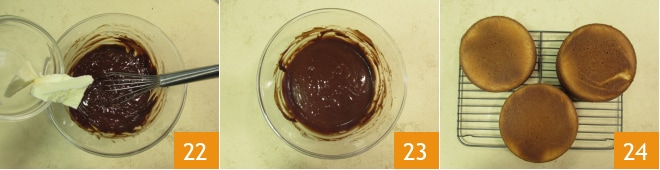 y añadid la mantequilla 22. Mezclad bien hasta que se haya disuelto 23. Cubrid con film y mantened a temperatura ambiente hasta el uso. En cuanto las tres tartas estén listas, sacadlas del horno y desmoldadlas sobre una rejilla 24; de este modo se enfriarán más rápido. Dejad enfriar una hora a temperatura ambiente y otra hora en el frigorífico.