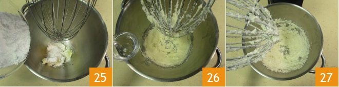 Preparad la crema de mantequilla. Verted la mantequilla suave y el azúcar glas en el bol de la batidora planetaria 25. Trabajad durante aproximadamente 1 min con la varilla, luego añadid también el orujo 26. Encended de nuevo la batidora y trabajad la crema con la varilla durante aproximadamente 5 min obteniendo una mezcla lisa, espumosa y brillante 27. Guardad a temperatura ambiente hasta el uso.