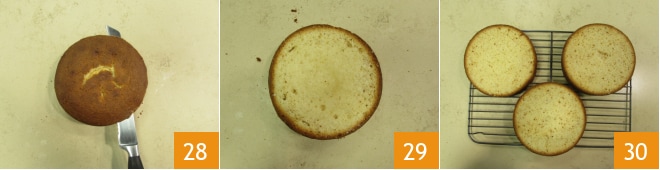 Recuperad entonces vuestras bases. Recortad con un cuchillo de sierra tanto la superficie 28 como la base 29. Realizad esta operación para las 3 tartas 30.