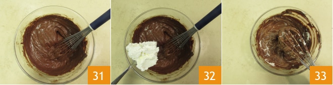 Recuperad la ganache de frambuesas y trabajadla con una varilla 31. Añadid poco a poco la nata montada y mezclad delicadamente 33 hasta obtener una crema homogénea.