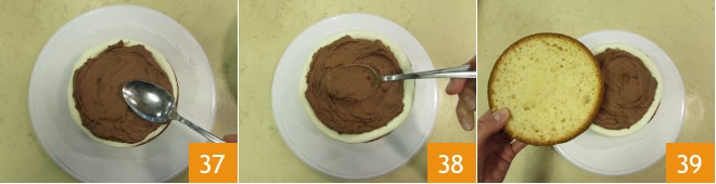 y extendidla con una cuchara 37. Colocad sobre la crema la segunda capa de tarta de chocolate blanco y rellenad como acabáis de hacer para la primera capa 38. Terminad colocando el último disco de tarta de chocolate blanco 39.