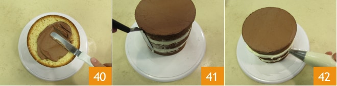 Cubrid la superficie con la ganache restante, alisándola bien 40. Luego utilizando la espátula, alisad bien también los bordes de la tarta 41 y dejad enfriar en el frigorífico durante 15 min. Recuperad entonces la tarta del frigorífico y esparcid un poco de crema de mantequilla en los bordes de la tarta 42.