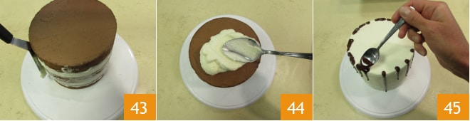 Alisad bien con una espátula 43, luego cubrid también la superficie 44 y alisad nuevamente con la espátula. La tarta deberá estar completamente cubierta con la crema de mantequilla. Dejad enfriar en el frigorífico durante 1 hora. En este punto calentad por pocos instantes la crema de cobertura, y utilizando una cucharita realizad el efecto drip vertiendo un poco de salsa en todo el borde exterior 45. Aseguraos de que algunas gotas bajen más que otras vertiendo una cantidad diferente de ganache.