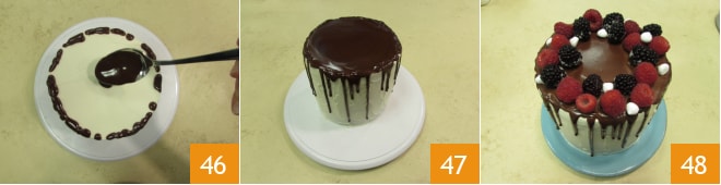 Cubrid, luego, la superficie con la ganache de cobertura restante 46 y alisad delicadamente con una espátula 47. Decorad la superficie con las frambuesas y las moras, terminando con algunas pequeñas merengues 48. La drip cake está lista para servir.