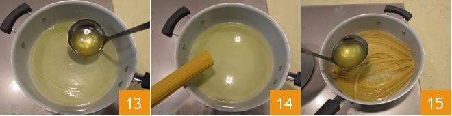 Vierta parte del caldo 13 en una cacerola y caliéntelo. Añada los espaguetis 14 y cuézalos añadiendo otro cucharón de caldo 15 si es necesario.