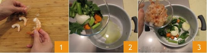 Para preparar los espaguetis con gambas, calabacines y brotes de soja, comience preparando la bisque. Primero pele las gambas 1, coloque la carne en el frigorífico y reserve los caparazones. En una cacerola, vierta el aceite y agregue la cebolla, el apio y la zanahoria cortados groseramente 2. Deje que se doren, luego agregue también los caparazones en la cacerola 3.
