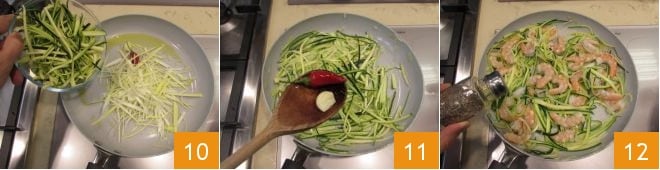 Vierta el aceite en una cacerola, agregue el ajo y la guindilla (puede dejarla entera haciéndole un corte o partirla por la mitad para freírla eliminando las semillas internas) y deje que se doren. Luego, añada tanto el puerro como los calabacines 10 y saltéelos por unos minutos. Elimine tanto el ajo como la guindilla y agregue las gambas. Saltéelas durante unos 1 minuto, agregue sal, pimienta 12 y apague el fuego.