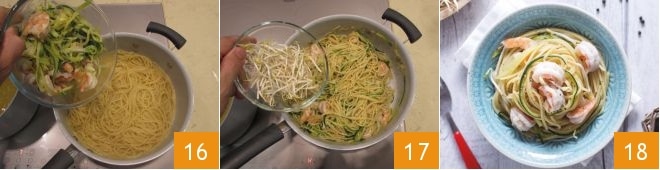 Una vez cocidos los espaguetis, añada las gambas y los calabacines 16, apague el fuego, añada los brotes de soja 17 y saltéelo todo durante un par de minutos. Emplate sus espaguetis con gambas, calabacines y brotes de soja 18 ¡y sirva!