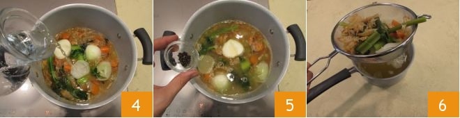 Espere unos minutos y vierta el agua 4. Añada algunos granos de pimienta 5 y deje cocinar durante unos 30 minutos a fuego moderado. Luego filtre todo 6 y reserve el caldo.