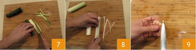 Lave y corte los extremos de los calabacines, luego córtelos primero en rodajas y después en tiras bastante finas 7. En este punto, prepare el puerro, elimine la parte más verde y córtelo del mismo tamaño que los calabacines 8. Vuelva a las gambas y con la ayuda de un cuchillo pequeño, hágales un corte a lo largo del lomo y retire el intestino 9.