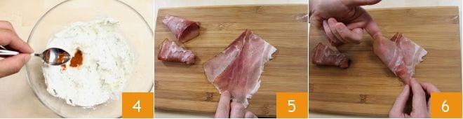 y añade una cucharada de pimentón dulce a la mezcla 4. Tan pronto como la crema esté lista, transfiérela a una manga pastelera con boquilla estrellada y ponla a un lado. Ahora toma las lonchas de speck y dóblalas sobre sí mismas para formar conos, sujetando con un dedo el extremo inferior de la loncha para facilitar la operación (5-6) (asegúrate de que la parte de la loncha con pimienta quede hacia afuera).