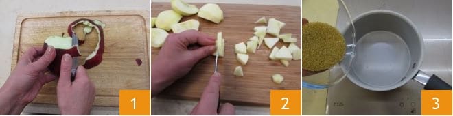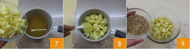 Una vez disuelto el azúcar, agregad las manzanas 7 y dejad ablandar a fuego muy lento durante 15 minutos, continuando a mezclar 8. Al final de la cocción, la manzana no debe deshacerse totalmente, pero debe quedar lo suficientemente blanda. Cuando esté lista, transferidla a un bol, dejad templar, luego añadid el granillo de avellanas 9.