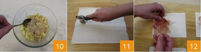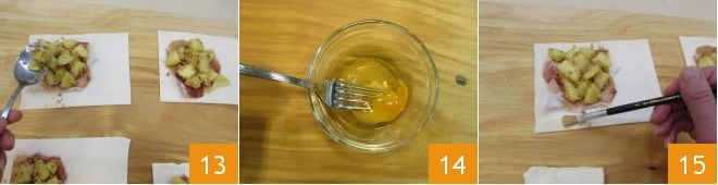Encima de ello, añadid unos trocitos de manzana 13 teniendo mucho cuidado de no añadir demasiado líquido de las manzanas porque podría humedecer demasiado la masa, haciendo que el líquido se salga durante la cocción en el horno. Repetid las operaciones para los otros 7 paquetitos, hasta agotar los ingredientes. Luego, tomad un huevo y batidlo con un tenedor 14: pinceladlo en los bordes de la masa para facilitar el cierre del paquetito 15.