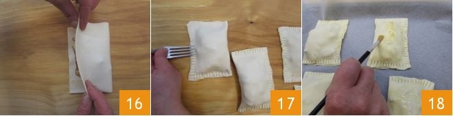 Cerrad los paquetitos a la mitad 16 y haced coincidir todos los bordes. Selladlos con los dientes de un tenedor 17 y así evitad la fuga del relleno durante la cocción. En este punto, los paquetitos están listos: colocadlos en una bandeja forrada con papel de horno y pincelad la superficie con el huevo batido restante 18. Finalmente, hornead en horno estático precalentado a 220° C durante unos 12 minutos (si usáis un horno ventilado a 200° C durante unos 8 minutos: os sugerimos, sin embargo, probar la cocción de un paquetito para regularos mejor con los otros).