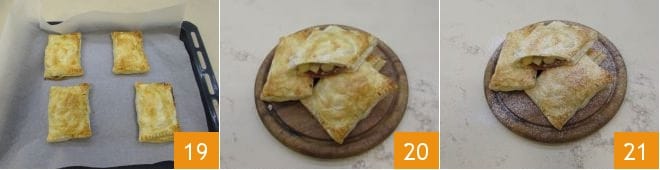Transcurrido este tiempo, sacadlos del horno 19 y dejadlos templar colocándolos sobre una tabla de cortar o un plato de servir 20. ¡Disfrutad de vuestros paquetitos de manzana y culatello 21!