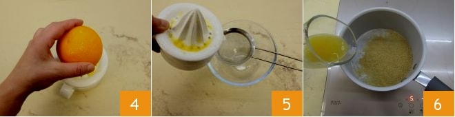 Después exprimid el jugo de una naranja 4 y filtradlo en un colador de malla fina recogiendo el jugo en un bol pequeño 5. Vertedlo en la cacerola 6. Calentad a fuego lento unos minutos mezclando bien los ingredientes para disolver el azúcar.