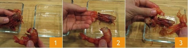 Para realizar los deditos de búfala, comienza limpiando las gambas rojas: separa la cabeza 1, las patas 2 y el caparazón incluida la cola 3.