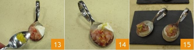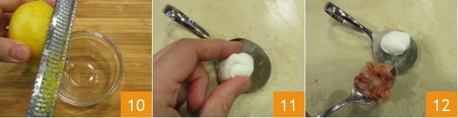 Ralla la cáscara de limón y recógela en un cuenco pequeño 10. Todo está listo para componer los deditos de búfala y gambas: toma una cuchara de aperitivo y coloca encima un bocado de búfala 11, añade también las gambas 12.