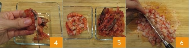 Haz un corte en el dorso con un cuchillito y extrae el intestino, es decir, el hilo negro 4. Una vez limpias las gambas 5, pícalas con el cuchillo sin triturarlas en exceso 6.