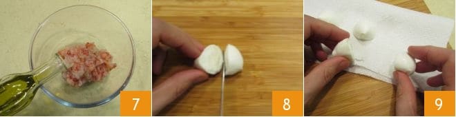 Ponlas en un bol y condiméntalas con aceite de oliva 7, sal y pimienta. Lava y seca la albahaca, córtala en tiras finas y agrégala al bol, mezcla para dar sabor. Ahora escurre los bocados de búfala de su agua de conservación, córtalos por la mitad 8 y sécalos suavemente con un paño de cocina 9.