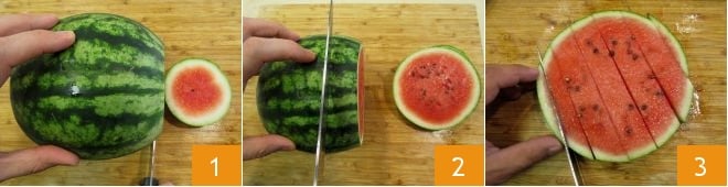 Para preparar los finger food de sandía y queso de cabra, comienza con la sandía baby bien fría: necesitarás en total aproximadamente 200 g, así que corta la tapa 1, realiza rebanadas de aproximadamente 3 cm de grosor 2 y haz cortes a una distancia de aproximadamente 3 cm uno del otro 3;