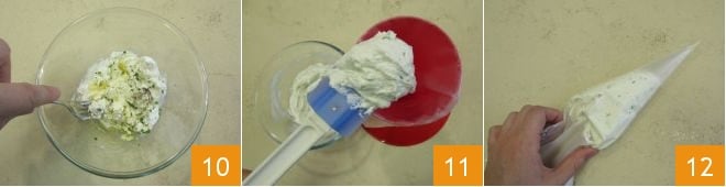 y trabaja todo para mezclar bien 10. Una vez obtenida una crema homogénea, viértela en una manga pastelera desechable 11, con boquilla estrellada de 6 mm.