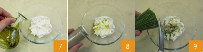 En un bol, vierte el queso de cabra y el aceite de oliva virgen extra 7, sal y pimienta 8; añade el cebollino picado, tomando la parte más verde y fragante 9