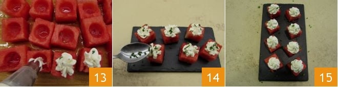 Rellena cada cubito con un copito de crema de queso de cabra 13, espolvorea al gusto con más cebollino picado 14 y sirve tus finger food de sandía y queso de cabra 15!