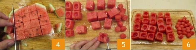 haz la misma operación en el otro sentido para crear una cuadrícula. Elimina la parte blanca y verde y obtén tus 20 cubitos 4, luego con una pequeña cuchara saca un hueco en cada cubito (5-6). Puedes reutilizar la parte interna desechada sumergiéndola en una fresquísima macedonia.